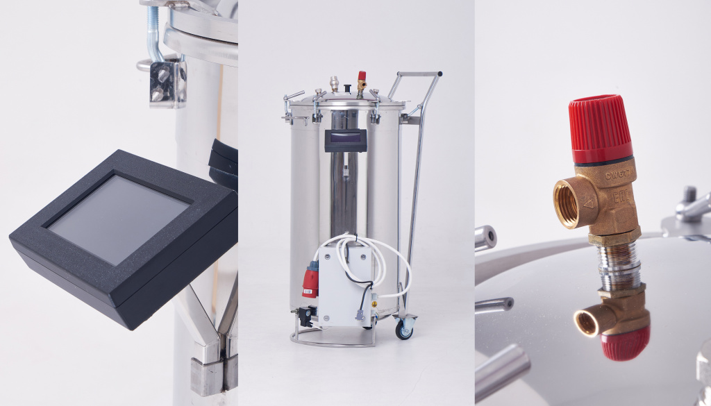 Электрический автоклав из нержавеющей стали с полностью автоматизированным процессом стерилизации. Оснащен электрическим блоком управления (ЭБУ) с возможностью стерилизации в 4 автоматических режимах "Мясо", "Птица", "Рыба", "Компот". В автоклаве предусмотрены автоматические режимы для жестяных банок и реторт-пакетов. Есть возможность сохранения до 10 собственных программ стерилизации для каждого вида упаковки.